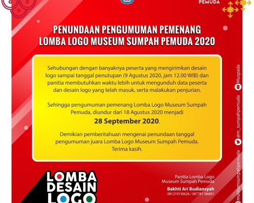 Sehubungan dengan banyaknya peserta yang mengirimkan desain logo sampai tanggal penutupan (9 Agustus 2020, jam 12.00 WIB) dan panitia membutuhkan waktu lebih untuk mengunduh data peserta dan desain logo yang telah masuk, serta malakukan penjurian. Sehingga pengumuman pemenang Lomba Logo Museum Sumpah Pemuda, diundur dari 18 Agustus 2020 menjadi 28 […]