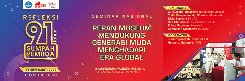 Dalam rangka memperingati 91 Tahun Sumpah Pemuda, museum sumpah pemuda akan menyelenggarakan Seminar Nasional dengan tema “Peran Museum Dalam Mendukung Generasi Muda Menghadapi Era Global”. Seminar Nasional ini akan dilaksanakan di Auditorium Museum Nasional, Jl. Medan merdeka Barat No. 12, Jakarta, Kamis (26/9/2019).