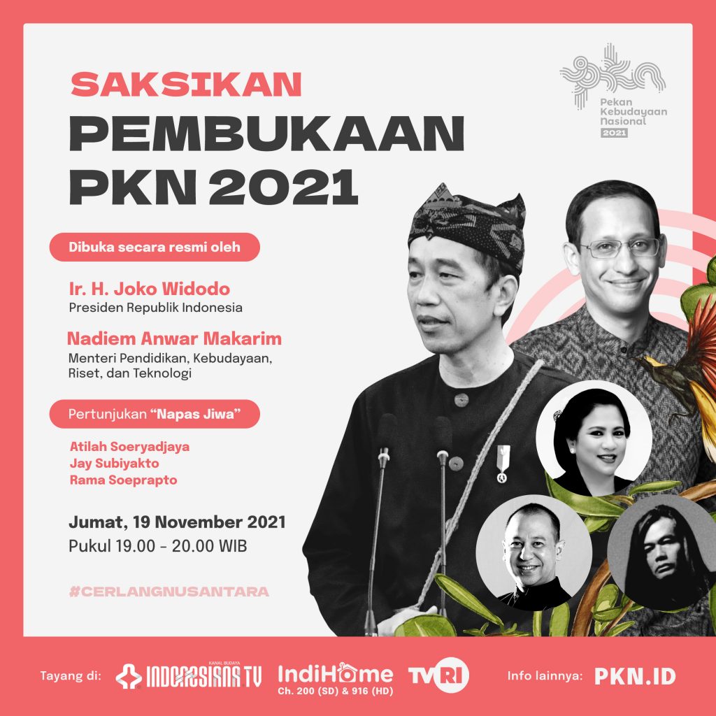 Pembukaan Pekan Kebudayaan Nasional hari ini akan dihadiri oleh Bapak Presiden Republik Indonesia Bapak Ir. H. Joko Widodo, Menteri Pendidikan, Kebudayaan, Riset dan Teknologi Bapak Nadiem Anwar Makarim, B.A., M.B.A. dan yang pastinya sudah dinantikan yaitu pertunjukan “Nafas Jiwa” karya Atilah Soeryadjaya, Jay Subiakto dan Rama Soeprapto.